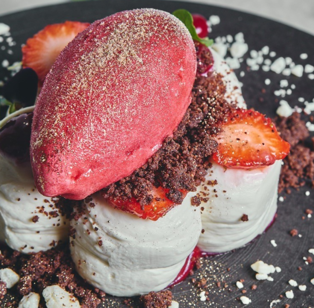 White chocolate cream, chocolate, and coffee brittle, raspberry fluid gel, served with raspberry sorbet.