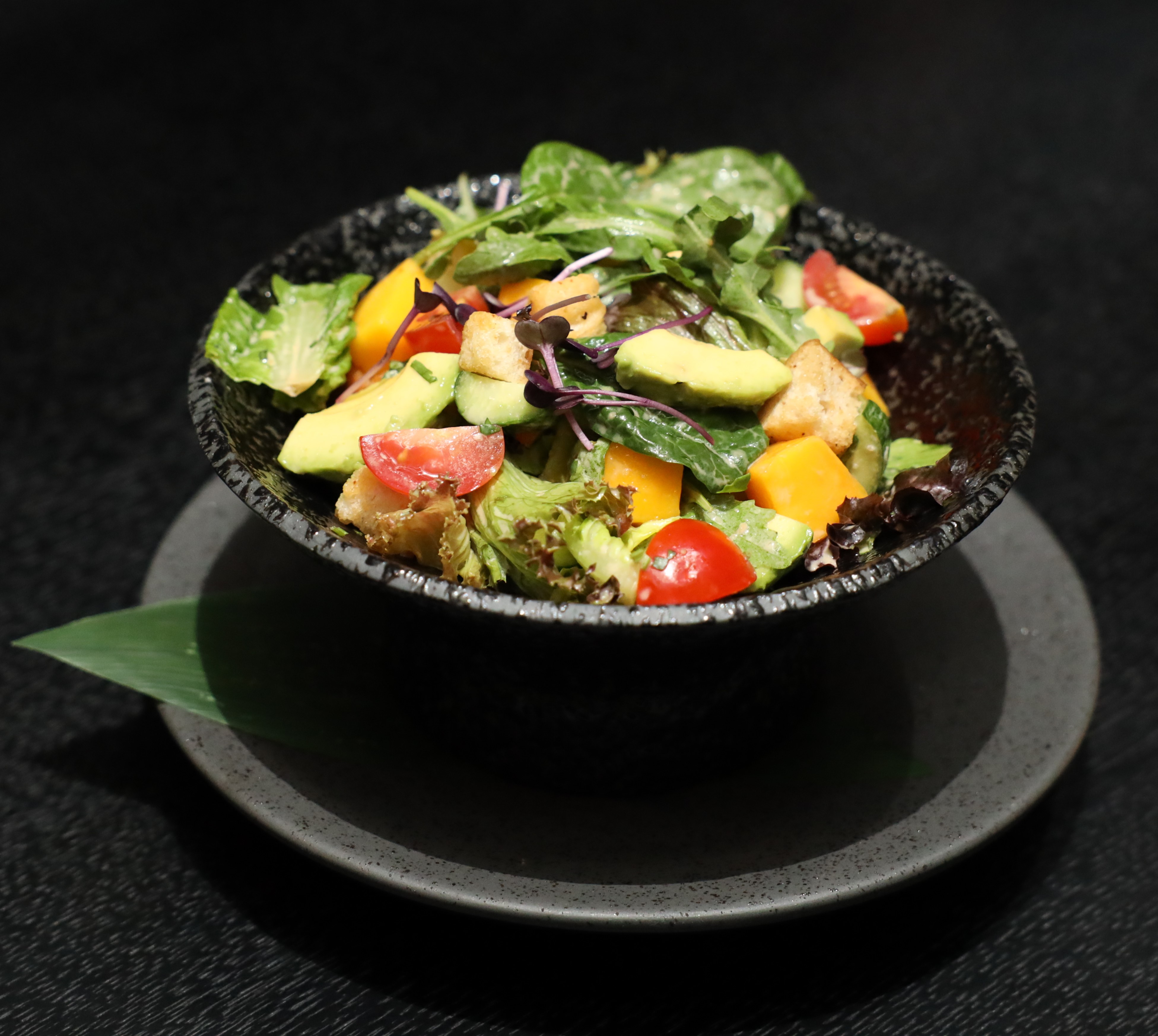 Mix lettuce, mango, cucumber, cherry tomato with ponzu-passion fruit dressing and bread crumbs