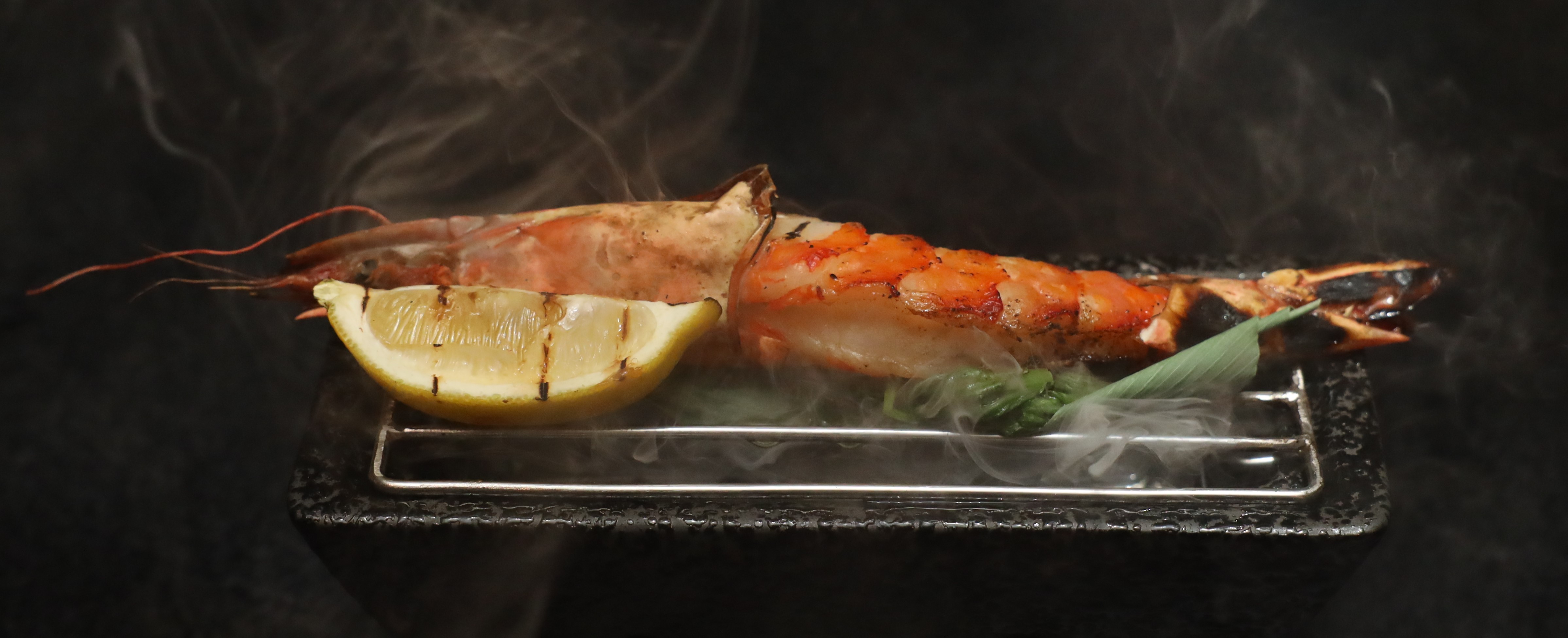 Grilled jumbo tiger prawn served with ponzu sauce, Japanese mixed chili powder. Calories:130 Allergies: Seafood and Egg